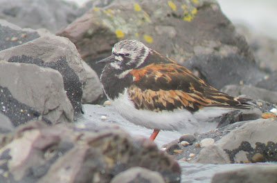 Verder liepen er ook nog, net zoals in de winter, tientallen steenlopers rond in vol ornaat, maar een paarse strandloper lukte me nog niet om te vinden. Met de harde wind van zaterdag hadden een flinke groep drieteenstrandlopers zich wel veilig op de dam opgesteld, en daar zat zowaar nog een geringd exemplaar tussen, ben benieuwd waar die vandaan komt! Ze hadden overigens wel behoorlijk moeite om de windkracht 9 te trotseren, en dat deden deze kleine beestjes helemaal niet onaardig.