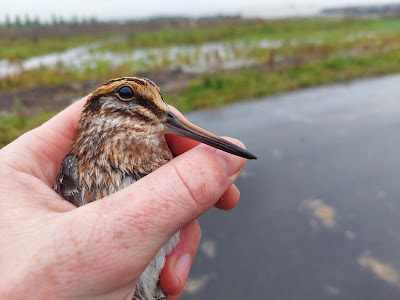 In een deel was er gelukkig ook nog stuk over waar tientallen watersnippen zaten en waar ook de komende tijd wel bokjes te verwachten zijn. Nu vond ik ze niet, maar leuker waren wel de eerste waterpiepers weer die ik goed kon controleren. En na vijf exemplaren was het raak: Rm/GWG. De eerste aflezing weer van een exemplaar dat ik afgelopen winter ringde en hier ook meerdere malen zag. Leuk! Ook een tapuit trok nog op met de groep piepers en kwikstaarten.